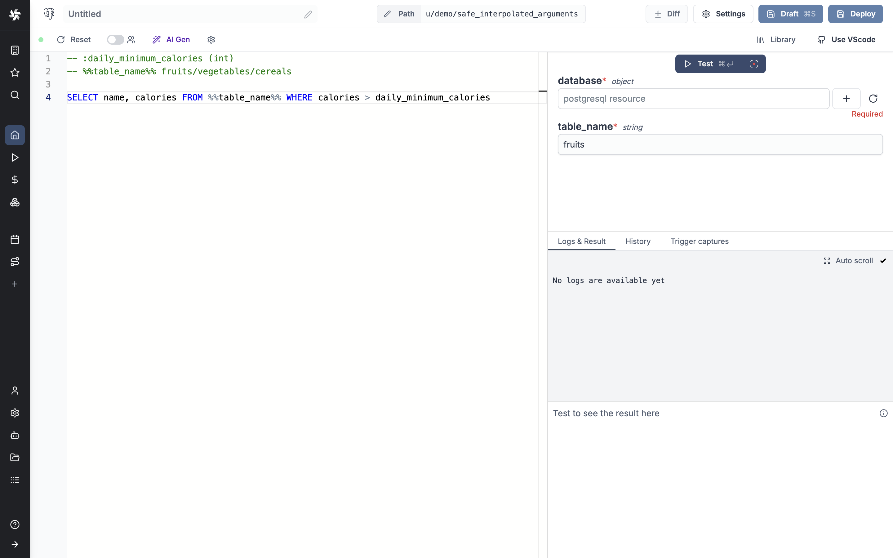 Backend schema validation and safe interpolated arguments for SQL queries.