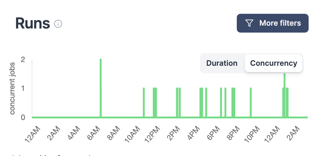 - Graphical view can be set to Concurrency (instead of Duration by default), allowing to see the number of concurrent jobs at a given time.