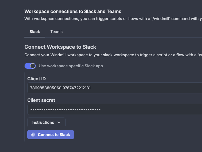 - Configure workspace-specific Slack app credentials (Client ID and Secret)